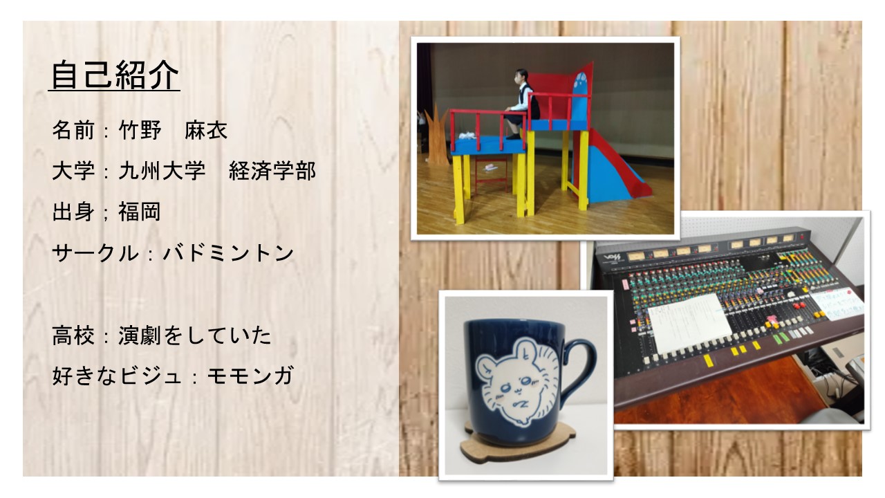自己紹介をします。名前は竹野麻衣と申します。