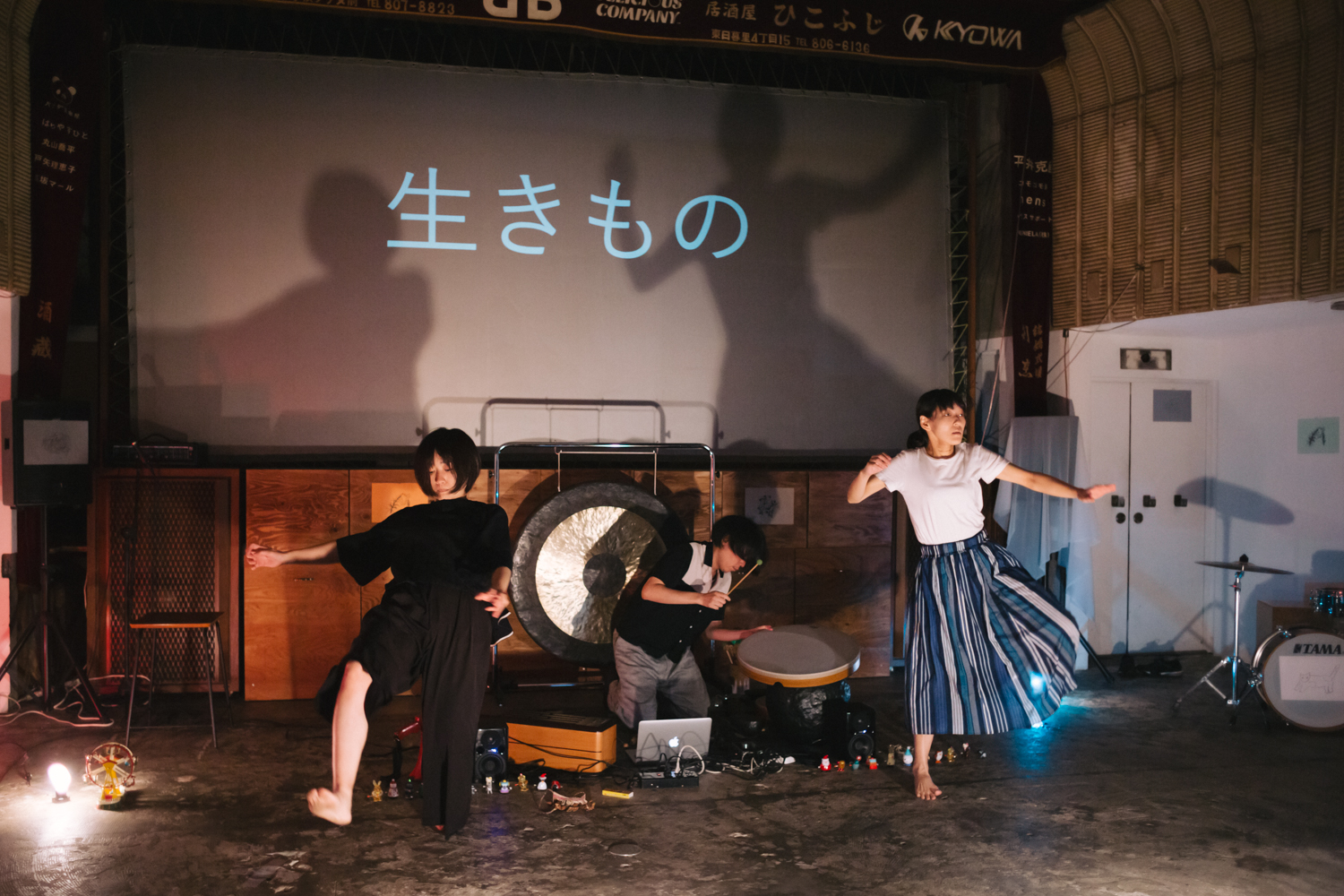 『黒と白と幽霊たち』は、東京を拠点に活動するバストリオの代表的なパフォーマンス作品。音楽家・松本一哉さんの生演奏、躍動感溢れるパフォーマーの身体、光と影、とさまざまな要素によって空間を揺り動かし、“ここ”と“どこか遠く”へと観客の思いと想像を掻き立てる、という作品です。